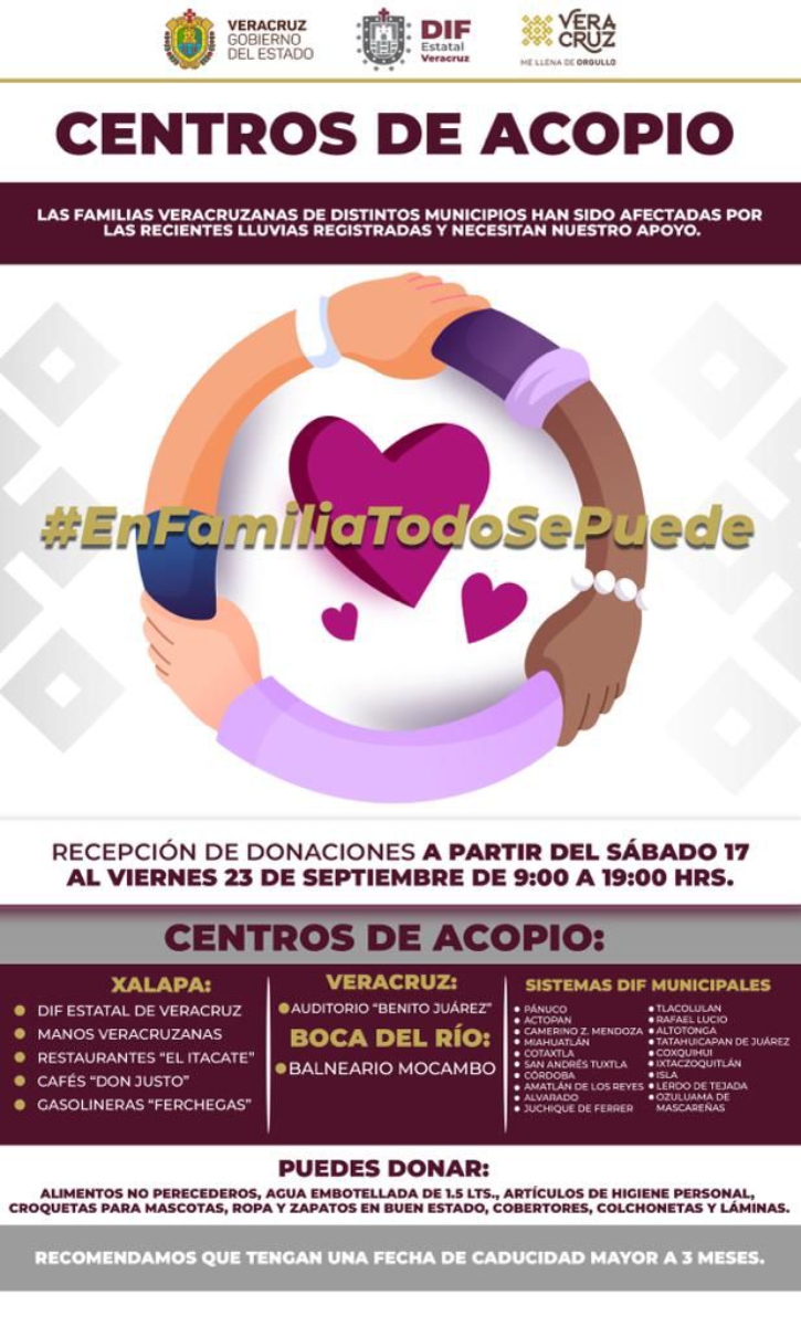 Xalapa, Ver.- El Gobierno de Veracruz, a través del DIF estatal, invita a la ciudadanía a los diversos centros de acopio abiertos desde este fin de semana y hasta el viernes 23 de septiembre para apoyar a las familias veracruzanas afectadas por las recientes lluvias en municipios de todo el estado.