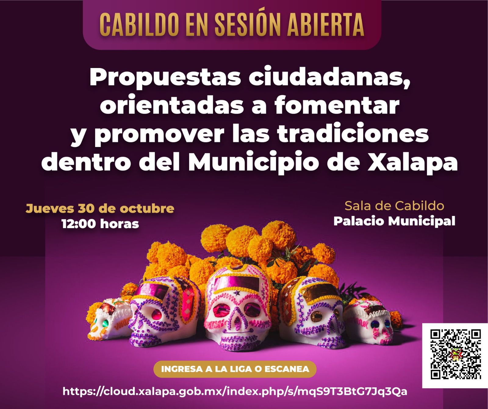 Xalapa, Ver.- Con el propósito de recibir, escuchar y analizar propuestas ciudadanas orientadas a fomentar y promover las tradiciones en el municipio de Xalapa, el próximo jueves 30 de octubre, a las 12:00 horas, se realizará el quinto Cabildo en sesión abierta del año, por lo que se invita a la ciudadanía a participar y presentar sus iniciativas en la materia.