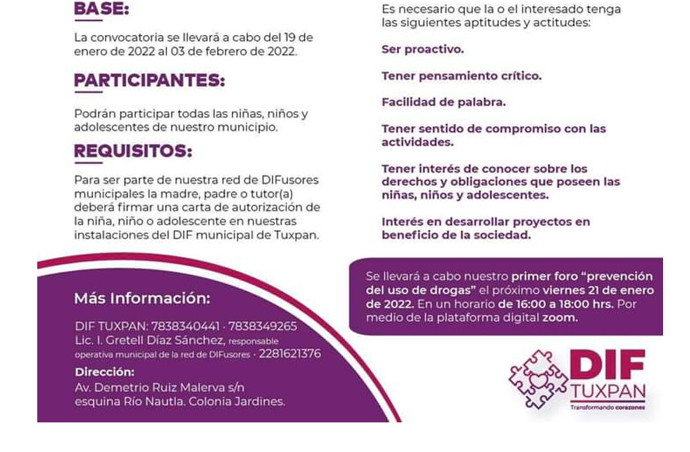Tuxpan, Ver.- El DIF Tuxpan 2022-2025 a cargo de la Lic. Pamela Morales Huesca invita a todas las niñas, niños y adolescentes de Tuxpan a que se sumen y juntos seguir #TransformandoCorazones❤️.