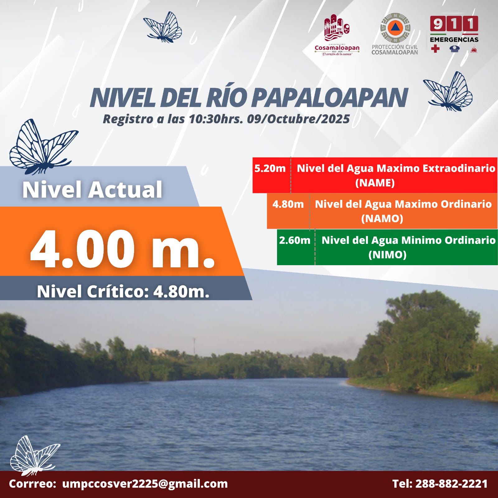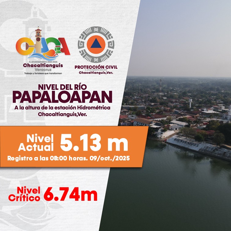 El nivel de las aguas está en cuatro metros de profundidad frente a Cosamaloapan, donde el nivel crítico es de 4.8 metros, mientras que en Chacaltianguis está en 5.13 metros, con nivel crítico en 6.74 metros, acercándose al riesgo de que se desborde el arroyo del Obispo.