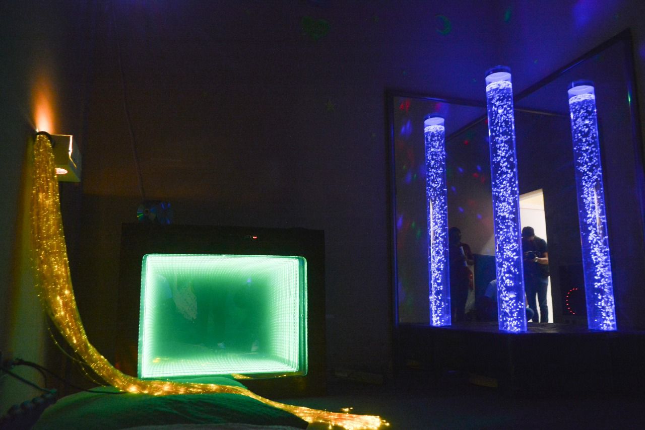 Esta área la diseñó ella misma y cuenta con música que genera un nivel de tranquilidad adecuado, tubo de burbujas, luces de colores con fibra óptica, un cubo de luces led con espejo y cristal.