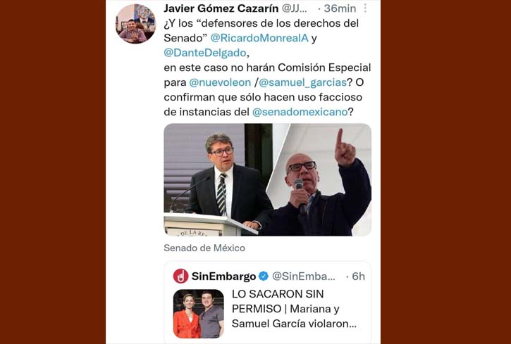 Xalapa, Ver.- El presidente de la Junta de Coordinación Política, Juan Javier Gómez Cazarín, cuestionó a través de Twitter, si los senadores Ricardo Monreal y Dante Delgado, crearán una Comisión Especial en el Senado de la República, para indagar la “adopción” de un menor de edad en Nuevo León, por parte del gobernador Samuel García y su esposa Mariana Rodríguez.