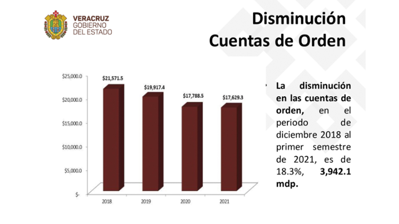 Mientras que la Cuentas del Orden registran una disminución, en el periodo de diciembre 2018 al primer semestre de 2021, de 3,942.1 mdp, es decir paso de 21 mil 574 mdp a 17 mil 629 mdp.