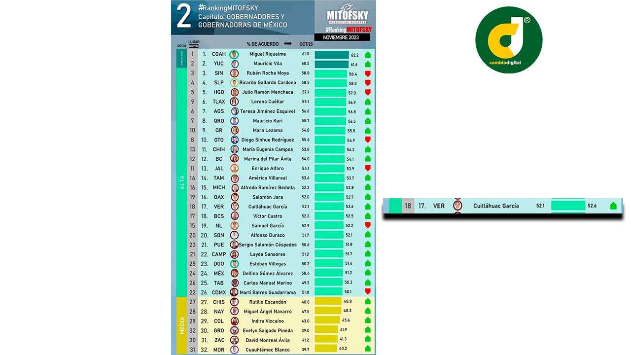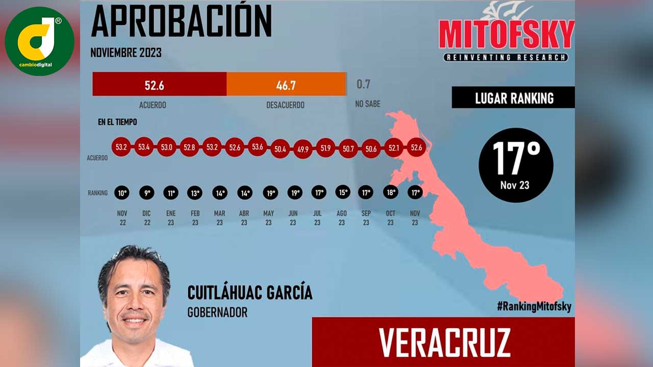 El gobernador de Veracruz, Cuitláhuac García Jiménez, llegó a su Quinto Informe con la aprobación del 52.6% de la población veracruzana, de acuerdo al “Ranking Mitofsky Capítulo: Gobernadores y gobernadoras de México”, realizado en noviembre.