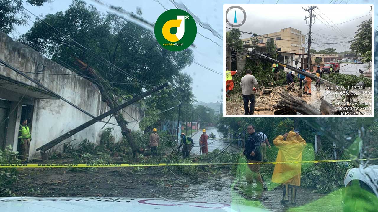Con trabajo coordinado entre la corporación municipal, CFE y Telmex, se dio atención a la caída de un árbol en la calle 5 de Mayo y Guadalupe Victoria, cerca de las instalaciones de la Comisión Municipal de Agua Potable y Saneamiento, el cual interrumpió el servicio eléctrico, telefónico y de internet en toda la zona.