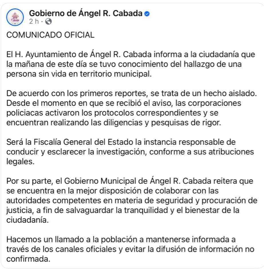 “La mañana de este día se tuvo conocimiento del hallazgo de una persona sin vida en territorio municipal. De acuerdo con los primeros reportes, se trata de un hecho aislado. Desde el momento en que se recibió el aviso, las corporaciones policiacas activaron los protocolos correspondientes y se encuentran realizando las diligencias y pesquisas de rigor.