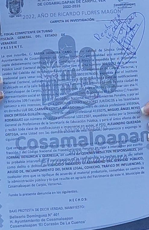 Ante la gravedad de los hechos, la representación legal del Ayuntamiento, acudió ante Fiscalía General del Estado, aperturándose la indagatoria correspondiente bajo el número de carpeta FIM/F2/128/2022, con la finalidad de deslindar responsabilidades y cumplir con el compromiso adquirido de actuar en forma profesional, oportuna y decididamente en contra de quienes, abusando de los cargos públicos, se enriquecen a costa de la ciudadanía.