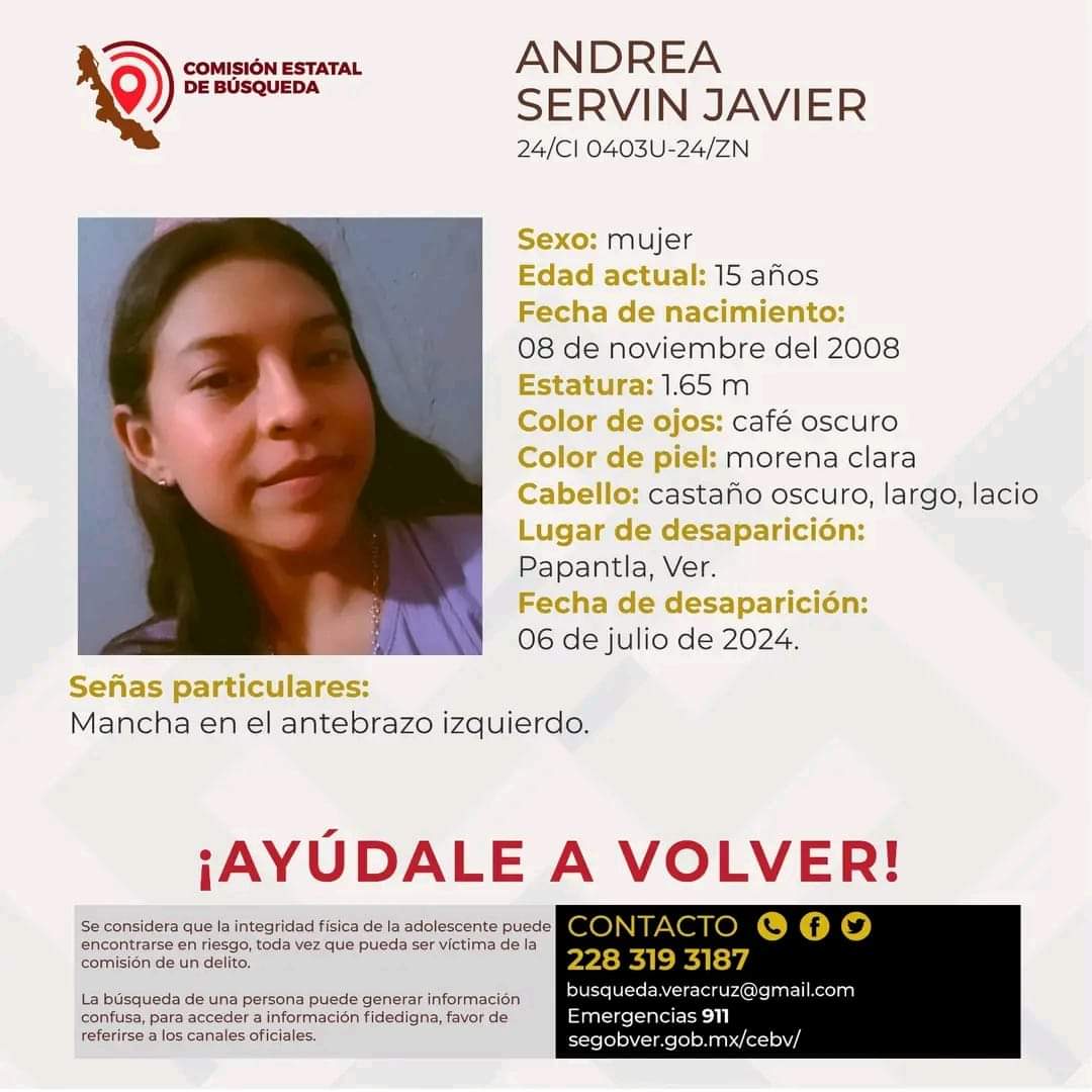 Las denuncias fueron interpuestas este martes 9 de julio, alrededor de las 13:00 horas. La primera se refiere a la desaparición de Andrea Servín Javier, una joven de apenas 15 años de edad, residente de esta cabecera municipal. Ha sido buscada activamente desde el pasado 6 de julio. Se describe a Andrea como una joven de 1.65 metros de estatura, ojos color café oscuro, tez morena clara, cabello castaño oscuro y una mancha distintiva en el antebrazo izquierdo.