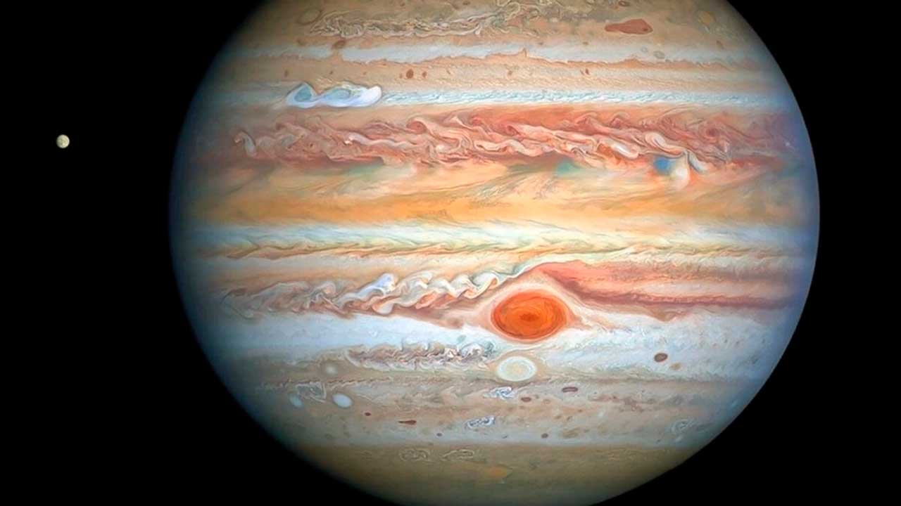 Júpiter, el quinto desde el Sol, es tan inmenso que todos los demás planetas cabrían dentro de él, incluyendo más de mil 300 Tierras. Júpiter está compuesto principalmente por hidrógeno y helio, con trazas de otros gases. Los fuertes vientos que se observan en forma de rayas y algunas tormentas dominan el colorido aspecto exterior de Júpiter.