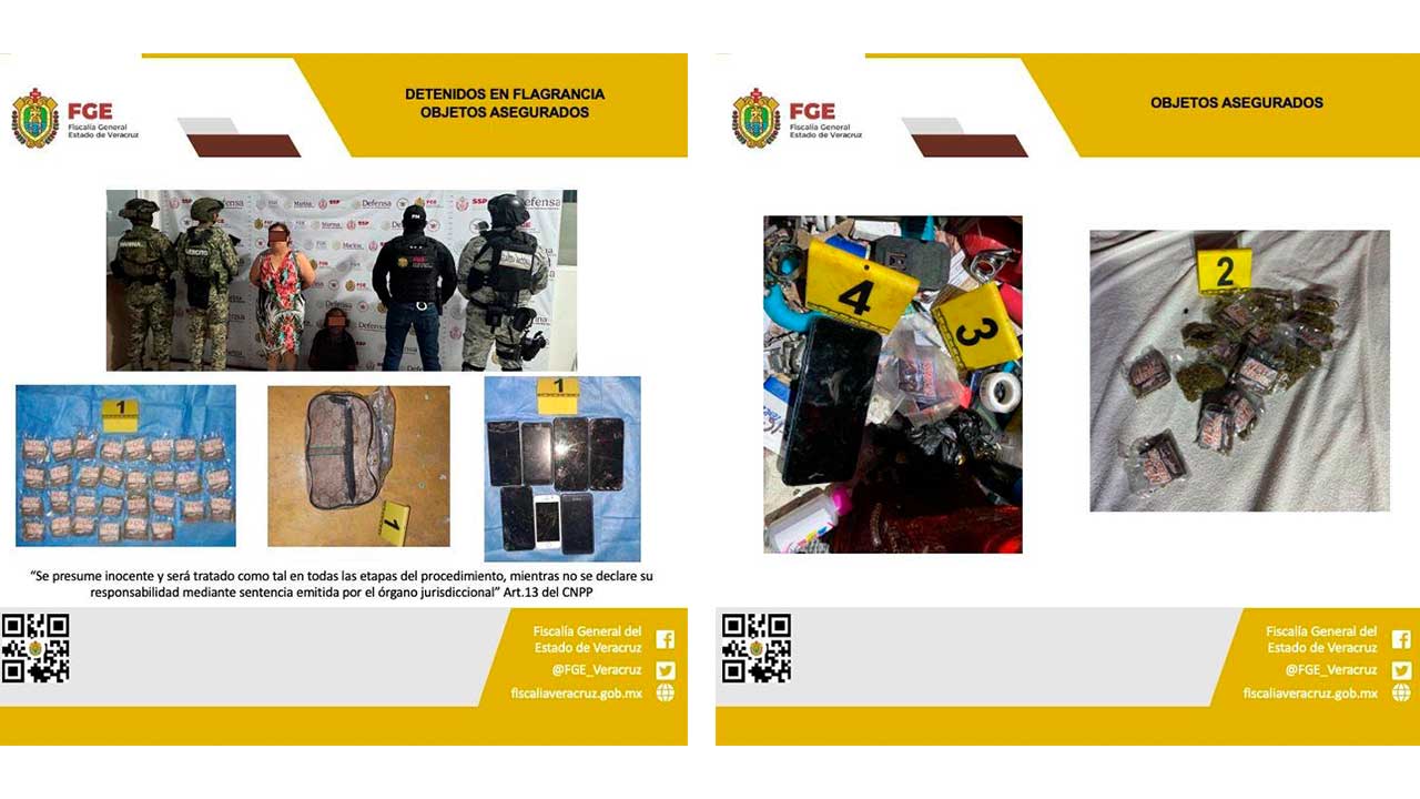 La Fiscalía de Veracruz informó que en diversos operativos y ejecuciones de órdenes de cateo en la ciudad de Veracruz se logró la detención de Rocío “N” y René “N”, como probables responsables de los delitos contra la salud y contra las instituciones de seguridad pública.