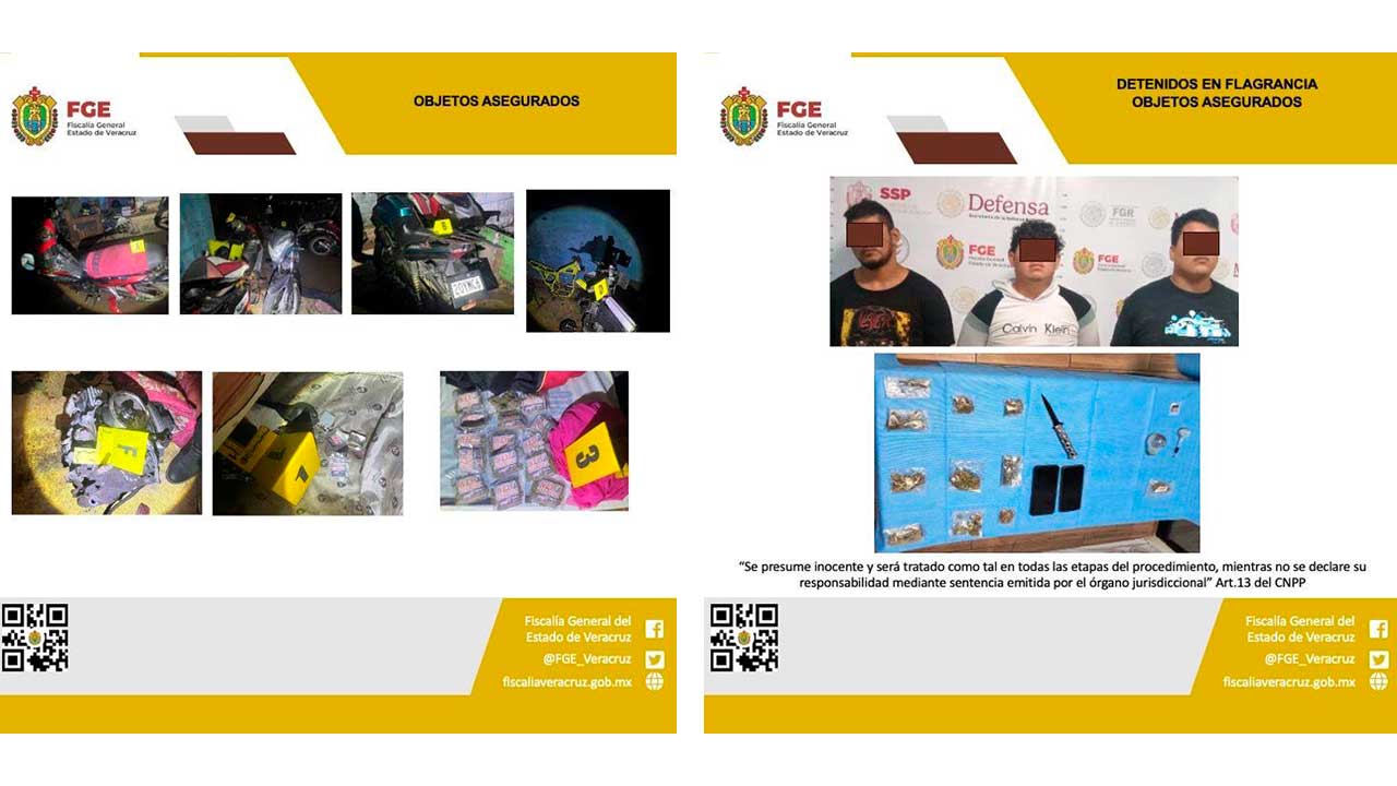 Veracruz, Ver.- En acciones conjuntas de la Secretaría de la Defensa Nacional, Secretaría de Marina, Guardia Nacional y la Secretaría de Seguridad Pública Estatal y la Fiscalía General del Estado fueron detenidas 11 personas con drogas, vehículos robados y otros objetos de delitos.