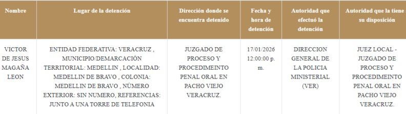 Este sábado 17 de enero, la Secretaría de Seguridad y Protección Ciudadana (SSPC) informó sobre la detención de Víctor “N”, exdirector administrativo de la Universidad Popular Autónoma de Veracruz (UPAV) en el municipio de Medellín, Veracruz. Según el Registro Nacional de Detenciones, la captura se llevó a cabo alrededor de las 12:00 horas del mismo día por parte de agentes de la Policía Ministerial del estado. Posteriormente, Víctor “N” fue puesto a disposición de un juzgado de proceso y procedimiento penal en Pacho Viejo, Veracruz. Cabe destacar que el detenido fue cesado de su cargo en la UPAV el 6 de noviembre de 2025 debido a un presunto uso indebido de recursos públicos y un supuesto desvío de más de 800 millones de pesos.