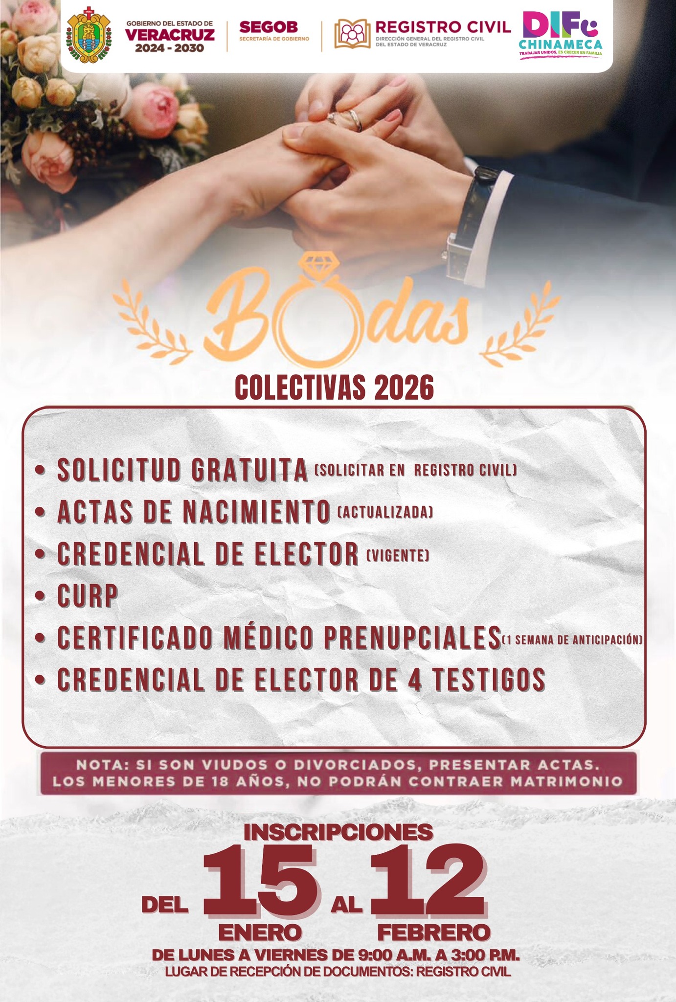 Chinameca, Ver.- Las Bodas Colectivas 2026 promueven el acceso al matrimonio civil, como un proceso legal que brinda certeza jurídica no sólo a las parejas, sino también a sus hijos e hijas, al garantizar el ejercicio de derechos y obligaciones dentro del marco legal, y contribuir así a la estabilidad y protección de las familias, en el marco del Día de San Valentín.