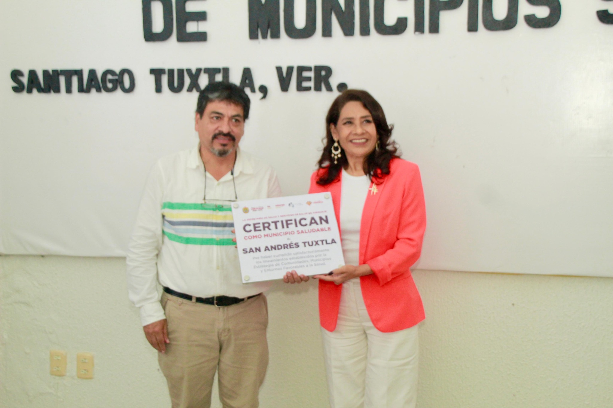 San Andrés Tuxtla, Ver.- Este martes, en un evento realizado en el vecino municipio de Santiago Tuxtla, el DIF Municipal de San Andrés, representado por su Directora, la licenciada Georgina Salas Armengol y el encargado del área médica, el químico Rony Esteban Bencomo Pérez, recibió la placa de reconocimiento con el Distintivo de Municipio Saludable, otorgado a través de la Jurisdicción Sanitaria No.