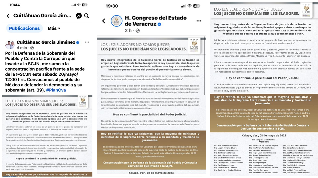 Los legisladores morenistas FF Veracruz “convocamos a una concentración pacífica frente a la sede de la Suprema Corte de Justicia de la Nación, en Pino Suárez 2, Colonia Centro, al lado del Palacio Nacional, este sábado 20 de mayo a las 12:00 horas, que denominaremos:
