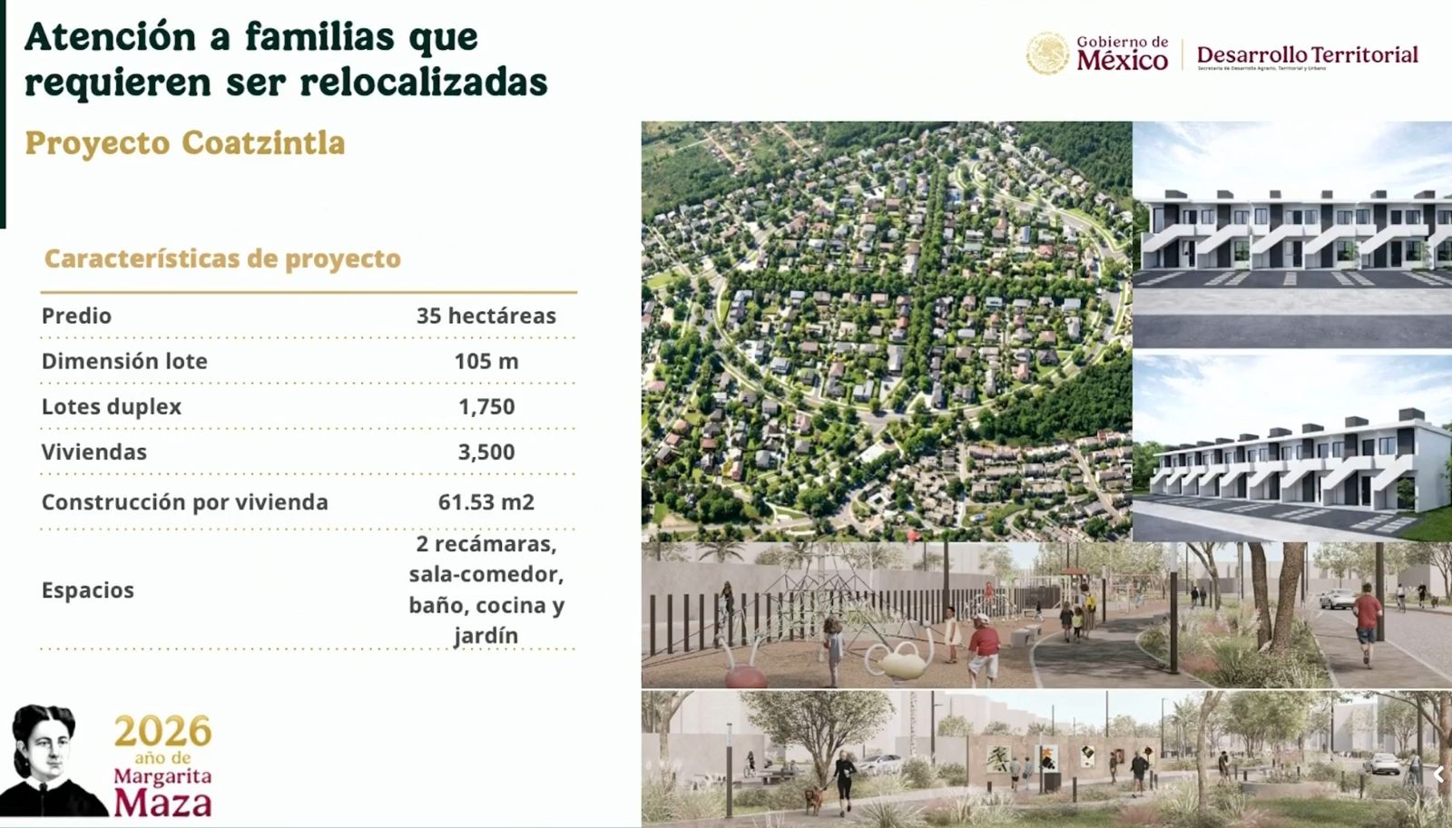 En la reubicación y dentro de la inversión que realizará el Gobierno Federal, el Proyecto Coatzintla contempla la construcción de 3mil 500 viviendas en un terreno de 35 hectáreas. El lote dúplex contará con 105 m², para la construcción de una vivienda de 61.53 m², que consiste en dos recámaras, sala, comedor, cocina y jardín.