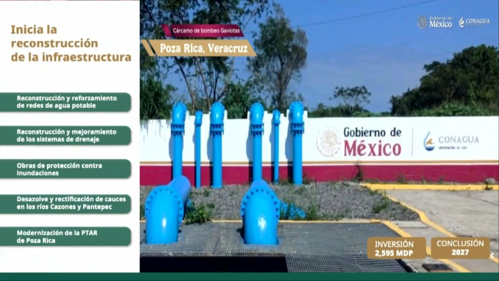 Veracruz, Ver.- Durante su visita a Veracruz, la presidenta de la República, Claudia Sheinbaum Pardo, destacó una inversión de 2 mil 595 millones de pesos para la zona norte, la mayor inversión será para Poza Rica, con obras como la reconstrucción y reforzamiento de redes de agua potable, reconstrucción y mejoramiento de los sistemas de drenaje, obras de protección contra inundaciones, desazolve y rectificación del cauce del río Cazones y modernización de la Planta Tratadora de Aguas Residuales de Poza Rica.