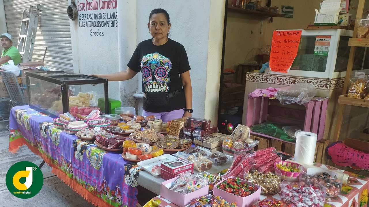 En el Pasillo de Su Bodega Mercado, Diana Ramírez, ha instalado su negocio con venta de dulces que se comercializa en esta temporada de día de muertos, ya que en los altares se coloca el dulce que era del agrado del familiar o amigo que se nos ha adelantado en el camino del viaje eterno.