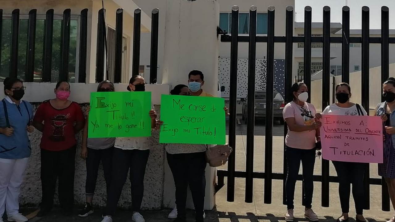 Medellín de Bravo, Ver.- Estudiantes de la primera generación de la maestría de Administración de los Servicios de Salud contra la Universidad de Oriente (UO), acusando que llevan más de dos años luchando por que les entreguen sus títulos.