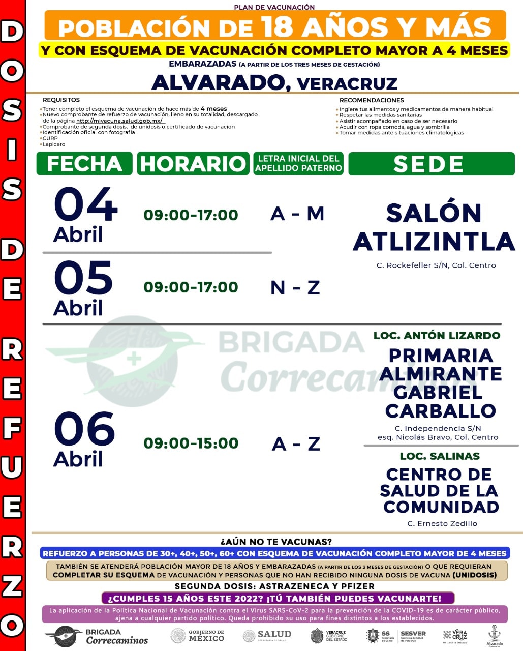 Alvarado, Ver.- El 4 y 5 de abril se llevará a cabo en el municipio de Alvarado la aplicación de la dosis de refuerzo de la vacuna Covid-19 a la población de 18 años y más, y con el esquema de vacunación completo mayor a cuatro meses.