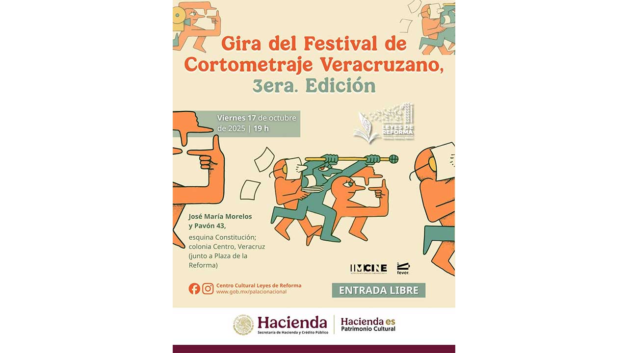 Veracruz, Ver.- El Centro Cultural Leyes de Reforma (CCLR), recinto de la Dirección General de la Conservaduría de Palacio Nacional y Patrimonio Cultural de la Secretaría de Hacienda y Crédito Público (SHCP), en colaboración con el Festival de Cortometraje Veracruzano (Fever), invita al público veracruzano a la muestra de inauguración de la Gira de Cortometrajes 2025, que tendrá lugar el viernes 17 de octubre a las 19:00 horas.