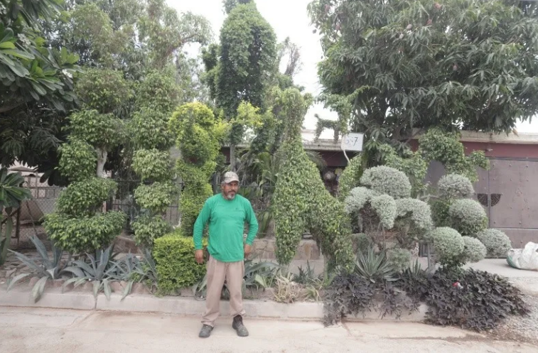 A sus 57 años, es experto en el arte topiario, pues le da vida a lugares con vegetación esculpiéndolas en diversas formas de la naturaleza, que van desde una inocente paloma hasta un dinosaurio.