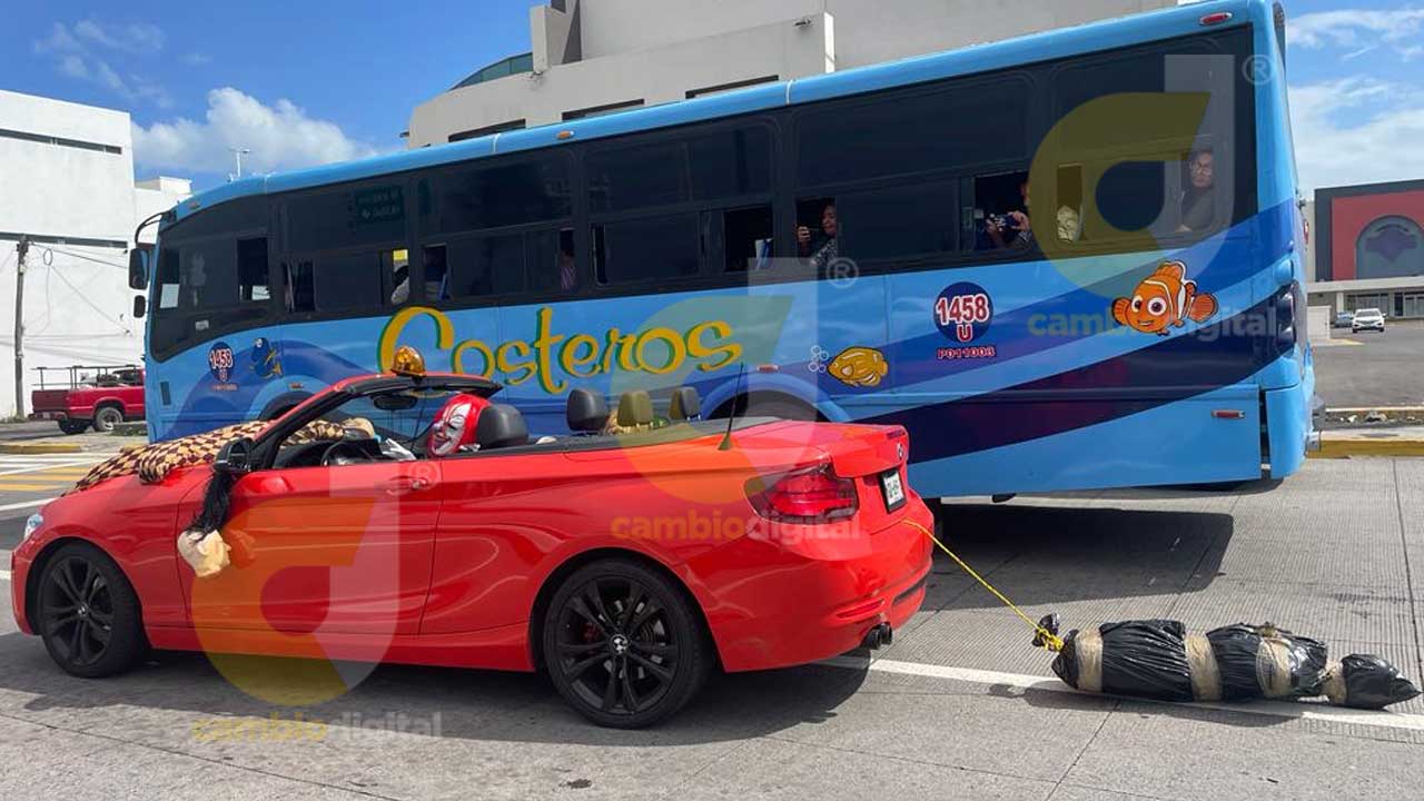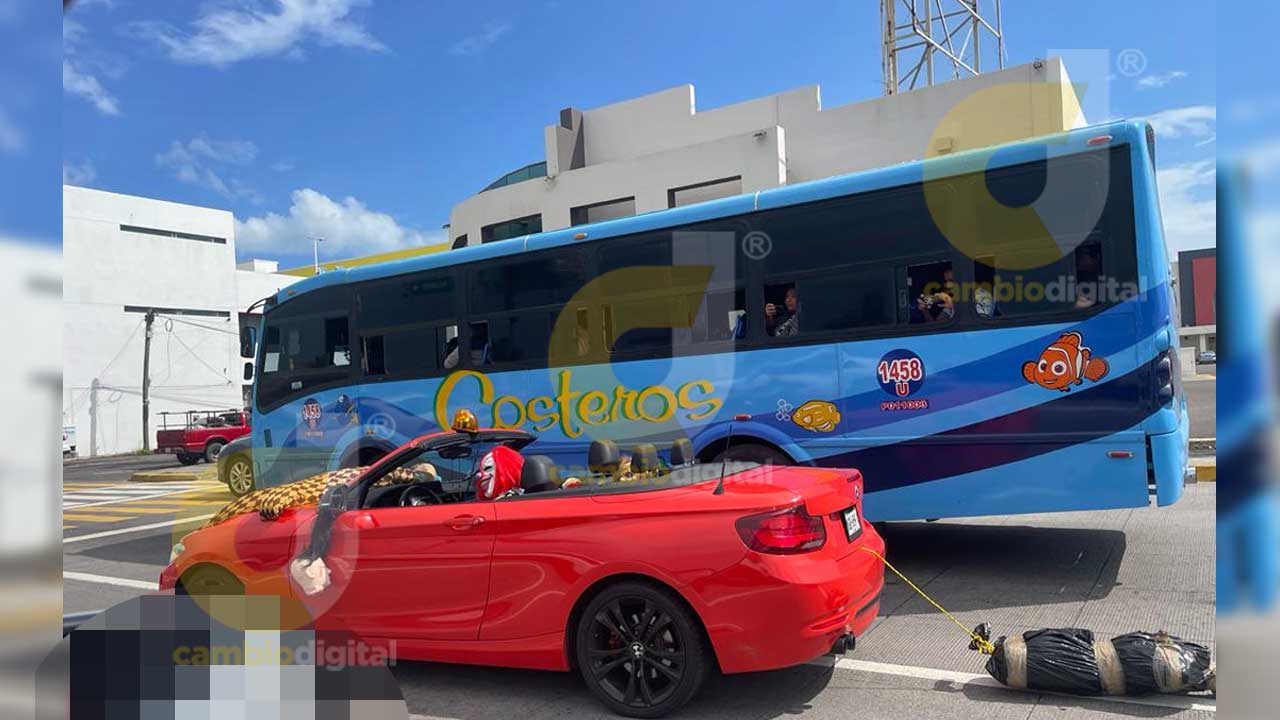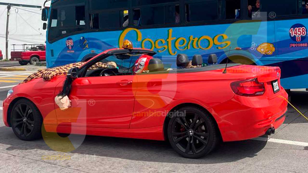 Boca del Río, Ver.- Por calles de la zona metropolitana Veracruz-Boca del Río, un hombre disfrazado del payaso “Eso” a bordo de un automóvil BMW rojo, arrastra a un “embolsado”.