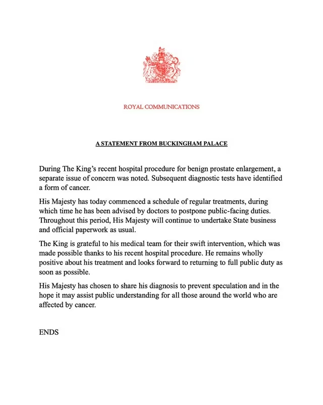 De acuerdo con la información, no se trata de un cáncer de próstata, sino que fue descubierto durante el reciente tratamiento al Rey Carlos III que lo mantuvo hospitalizado.