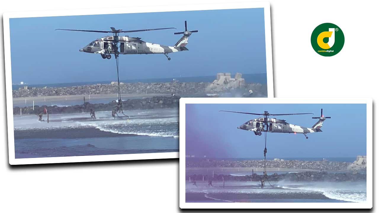 En las demostraciones de búsqueda, rescate y operaciones anfibias, participó el personal que integra la Infantería de Marina de la Armada de México.