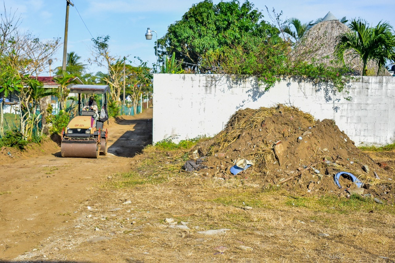 También, con el apoyo de una aplanadora, empleados de Maquinaria Pesada conforman el suelo para dejarlo en condiciones óptimas que permitan pavimentar el andador con asfalto recuperado entre la avenida Mártires de Chicago y la iglesia “Santa María Reina del Rosario”.