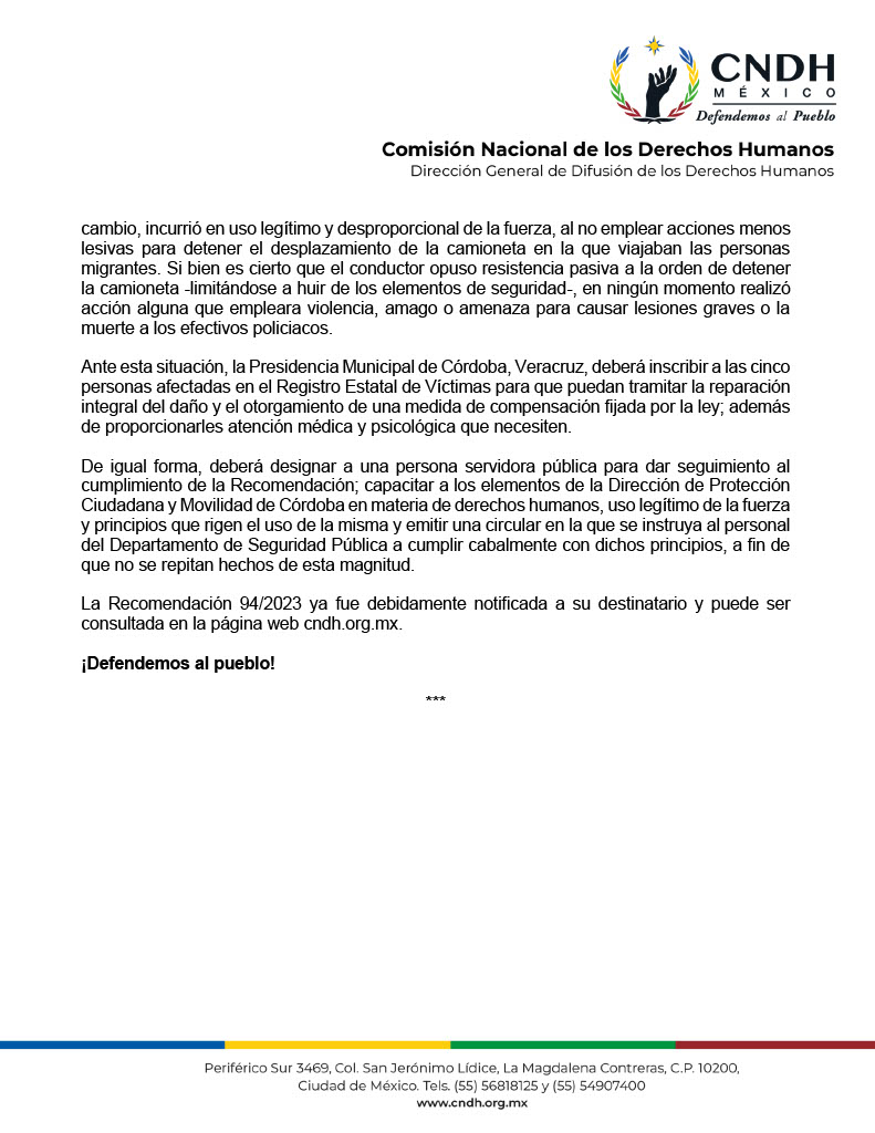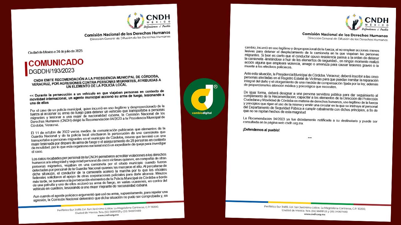 La recomendación 94/2023 detalla que el 11 de octubre de 2022 un grupo de 28 migrantes que viajaba sobre la carretera Córdoba-Amatlán de los Reyes, a la altura de la colonia Pino Suárez, fueron agredidos a disparos por policías municipales, cuando personal les marcaron el alto y el conductor no se detuvo de inmediato.