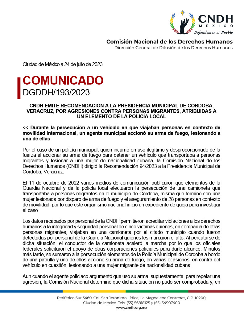 Córdoba, Ver.- Este día, la Comisión Nacional de Derechos Humanos (CNDH), emitió una recomendación al ayuntamiento de Córdoba por agresiones cometidas por sus policías municipales en contra de migrantes, en hechos ocurrido en octubre de 2022.