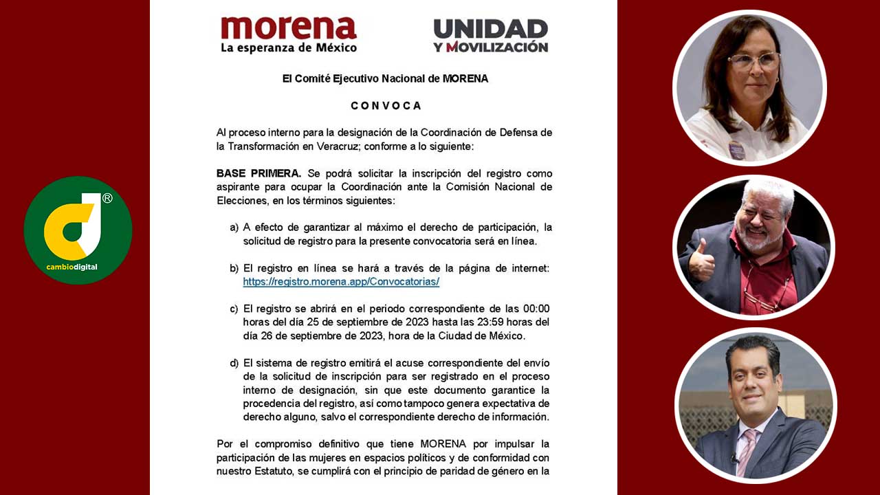 Boca del Río, Ver.- El Movimiento de Regeneración Nacional emitió la convocatoria para elegir a su candidato a la gubernatura de Veracruz, en la que destaca que los aspirantes a la coordinación de la Defensa de la Cuarta Transformación no están obligados a renunciar a los cargos públicos que ocupan, hasta 90 días antes del proceso electoral de 2024.