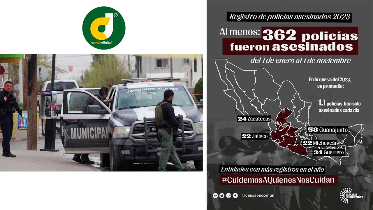 Los estados con mayor cantidad de policías asesinados en el año son Guanajuato (60), Guerrero (40), Zacatecas (32), Michoacán (28) y Jalisco (24).