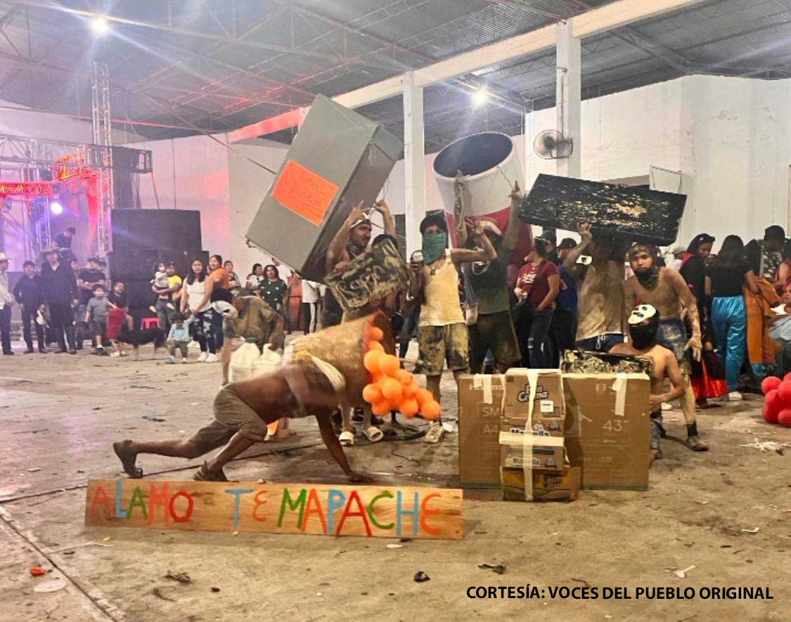 Álamo, Ver.- A cuatro meses de la tragedia que acabó con el patrimonio de miles de familias en Álamo Temapache, al debordarse el río Pantepec e inundar toda la ciudad y la mayoría de las comunidades, habitantes del ejido Emiliano Zapata replicaron durante la celebración del Carnaval 2026 la caída del monumento de El Colotero y los saqueos y rapiña tras las inundaciones.