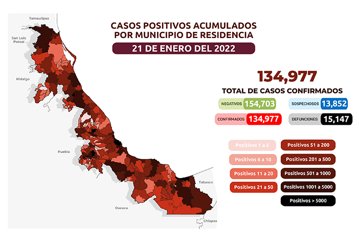 Xalapa, Ver.- Con 303 mil 532 estudios practicados, la Secretaría de Salud (SS) ha confirmado 134 mil 977 (+ mil 251 nuevos) casos de COVID-19 en Veracruz, 6 mil 583 positivos activos y 913 sospechosos actuales.