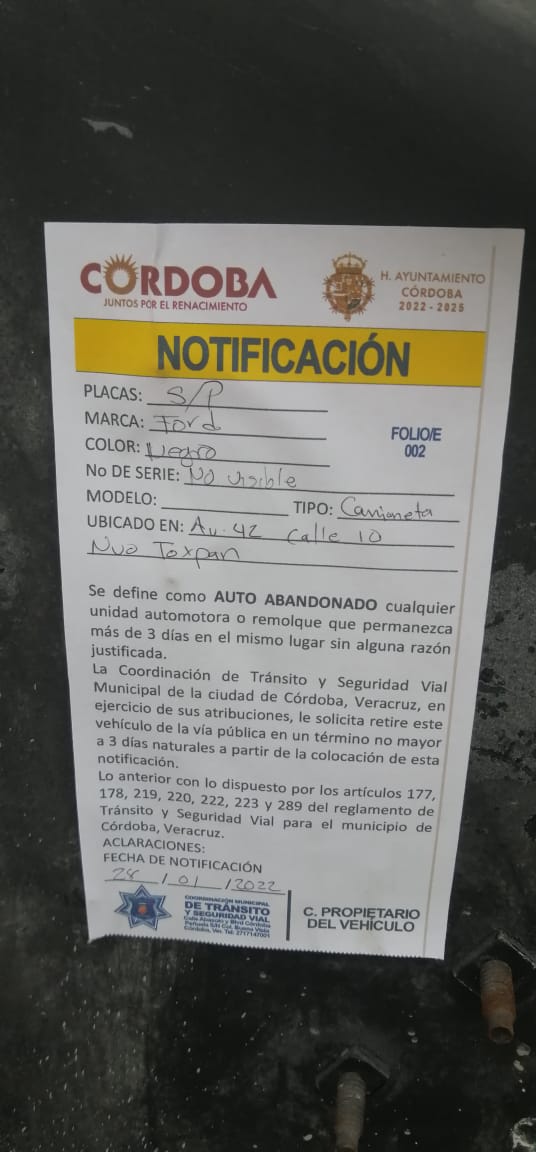 Córdoba, Ver.- En apoyo al reordenamiento vial de la ciudad, la coordinación de Tránsito y Seguridad Vial, informa que se encuentra activo el operativo de autos maceta o abandonados en la vía pública, advierten que de detectarse, se apercibe a los propietarios para que sean retirados en un plazo de tres días.