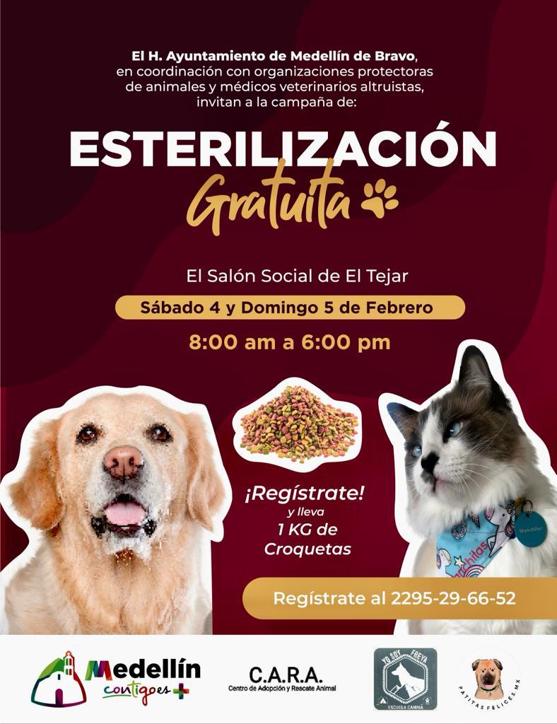 Medellín de Bravo, Ver 02 febrero de 2023.- Con el objetivo de coadyuvar en la economía de las familias medellinenses poseedoras de mascotas, el alcalde Marcos Isleño Andrade instruyó la realización de la campaña de esterilización de perros y gatos que se llevará a cabo de forma gratuita este 4 y 5 de febrero en el salón social de El Tejar.
