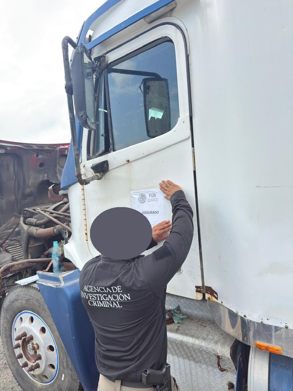 Los agentes federales localizaron y aseguraron tres vehículos tipo tractocamión, dos tipo Dolly, siete tipo caja seca, cuatro semirremolques tipo casa rodante, una motocicleta y siete unidades tipo caja seca que se encontraban calcinados.