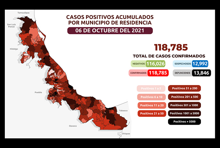 Xalapa, Ver.- Al corte de las 19:00 horas, la Secretaría de Salud (SS) confirma 118 mil 785 (+ 242 nuevos) casos confirmados de COVID-19 en la entidad, de 247 mil 803 eventos analizados.