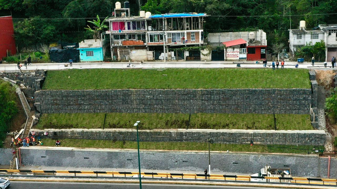 Además, en las laterales del puente Macuiltépetl se construyó un muro de contención con estructuras de gaviones. También se estabilizó el terreno y colocaron drenes para evitar la infiltración de escurrimientos pluviales, todo ello, en beneficio de las familias que habitan en la zona.