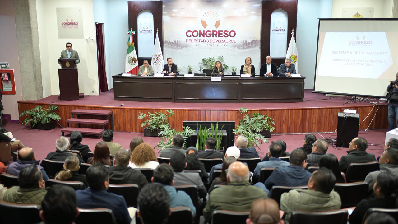 Xalapa, Ver., 27 de enero de 2026.- Con un llamado a administrar con inteligencia, fortalecer las finanzas propias y garantizar que los recursos públicos se traduzcan en servicios, obra pública y atención social de calidad, el presidente de la Junta de Coordinación Política, diputado Esteban Bautista Hernández, encabezó la entrega de Leyes de Ingresos a las autoridades de los 212 municipios de Veracruz, celebrada en el auditorio Sebastián Lerdo de Tejada del Palacio Legislativo.