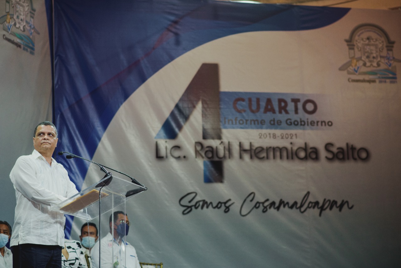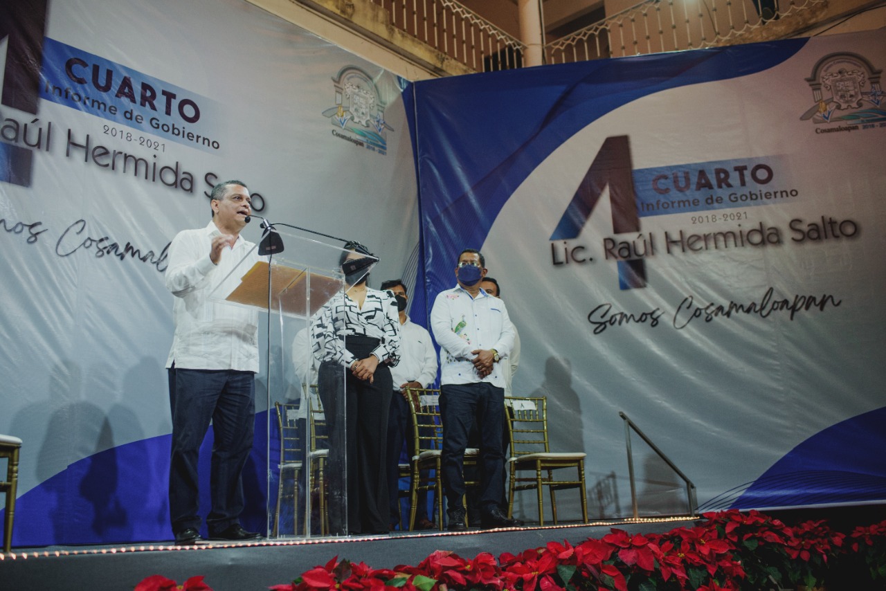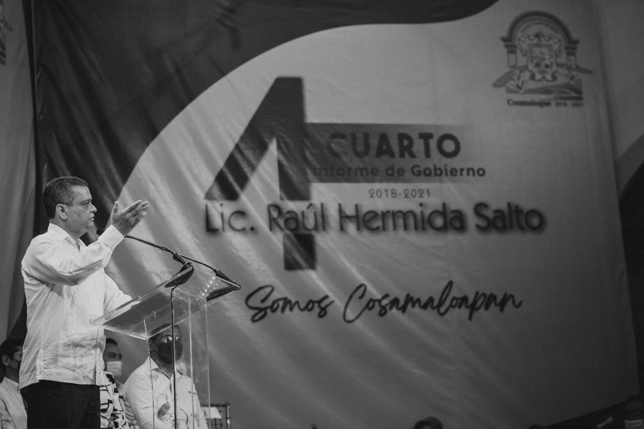 Cosamaloapan, Ver.- Al rendir su Cuarto Informe de Gobierno, el alcalde de Cosamaloapan, Raúl Hermida Salto, recordó al regidor Silviano Clemente Moreno, y a Tereso Enríquez Segundo, su suplente, fallecidos durante la pandemia de Covid 19, dedicándoles un minuto de aplausos, así como también recapituló el desastre financiero que enfrentó al asumir dicha administración, recalcando que entregara, de forma transparente, sin pasivos pendientes, sin adeudos salariales y de aguinaldo, y completamente saneada.