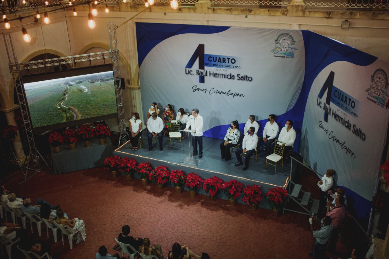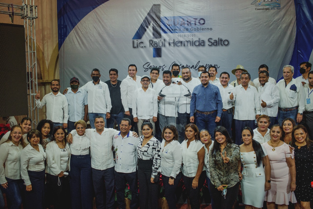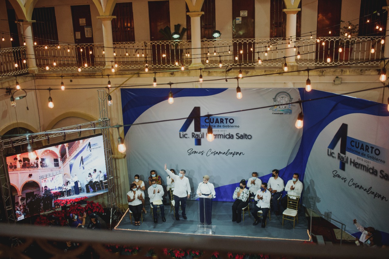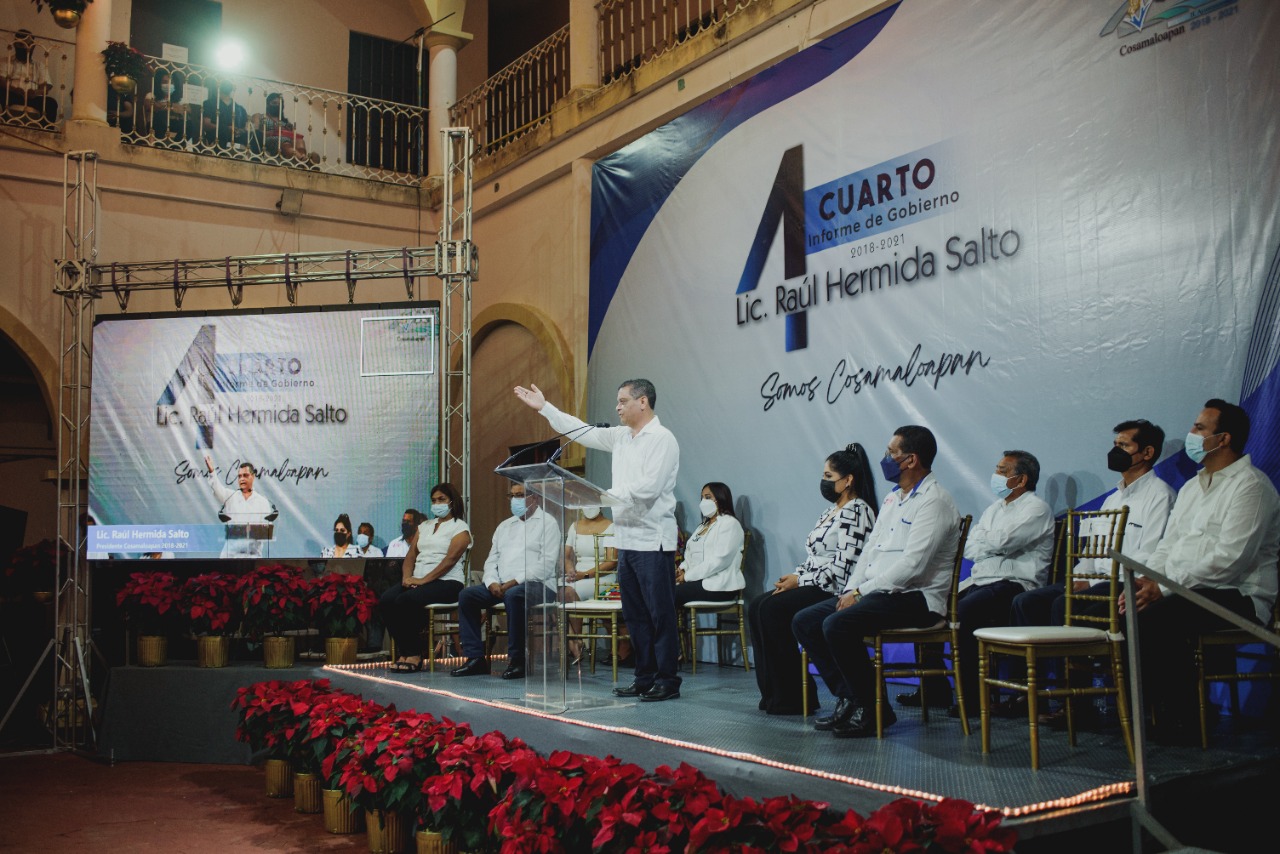 Cosamaloapan, Ver.- Al rendir su Cuarto Informe de Gobierno, el alcalde de Cosamaloapan, Raúl Hermida Salto, recordó al regidor Silviano Clemente Moreno, y a Tereso Enríquez Segundo, su suplente, fallecidos durante la pandemia de Covid 19, dedicándoles un minuto de aplausos, así como también recapituló el desastre financiero que enfrentó al asumir dicha administración, recalcando que entregara, de forma transparente, sin pasivos pendientes, sin adeudos salariales y de aguinaldo, y completamente saneada.