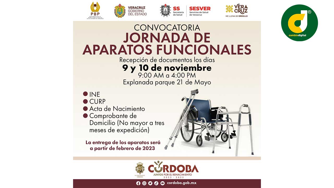 Córdoba, Ver. – Servicios de Salud de Veracruz (Sesver) y la Beneficencia Pública Federal, en coordinación con el Ayuntamiento de Córdoba trabajan de la mano en beneficio de la población que requieran de un aparato de movilidad, auditivos o lentes, esto como parte de la campaña gratuita: “Jornada de Aparatos Funcionales”, para lo cual, los interesados podrán entregar sus documentos los días 9 y 10 de noviembre en la explanada del parque 21 de Mayo de 9:00 a 16:00 horas.