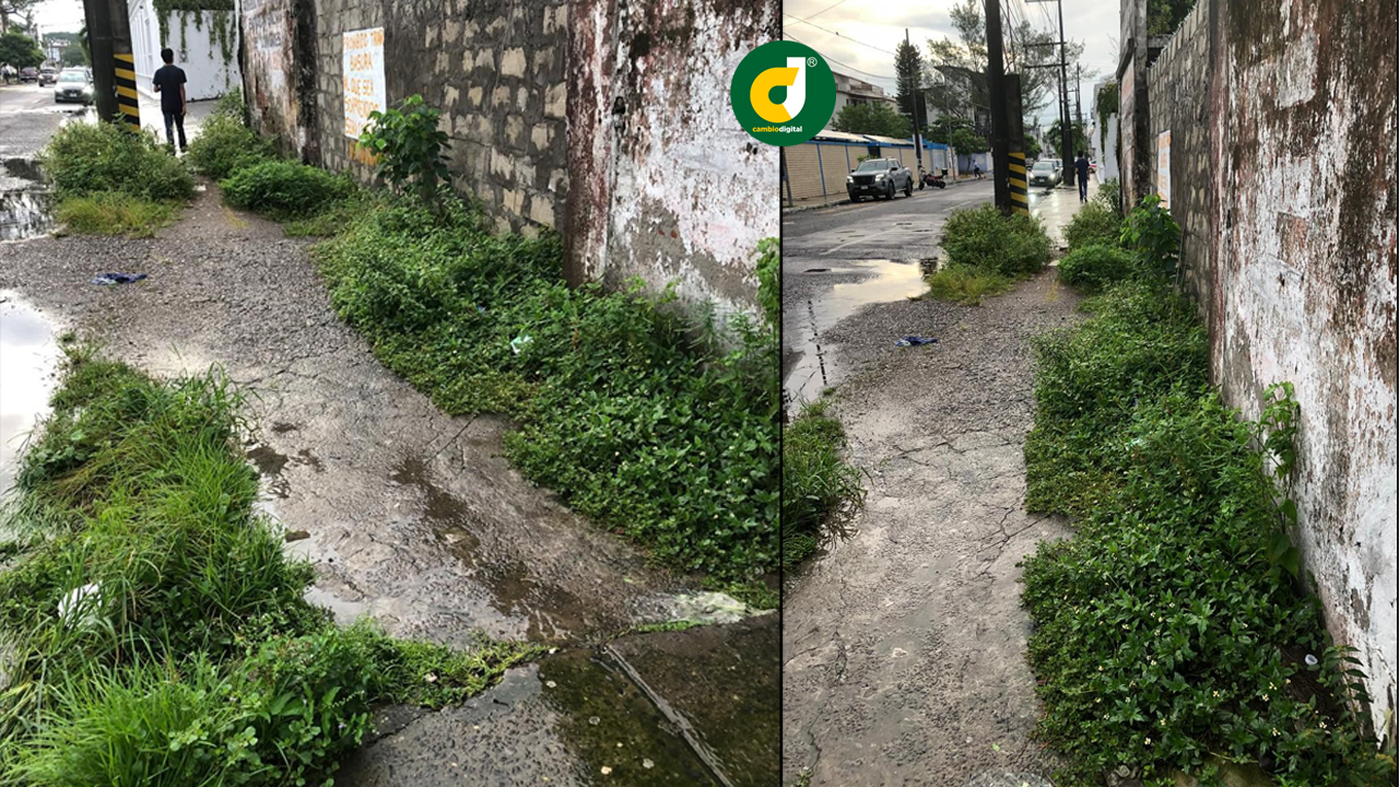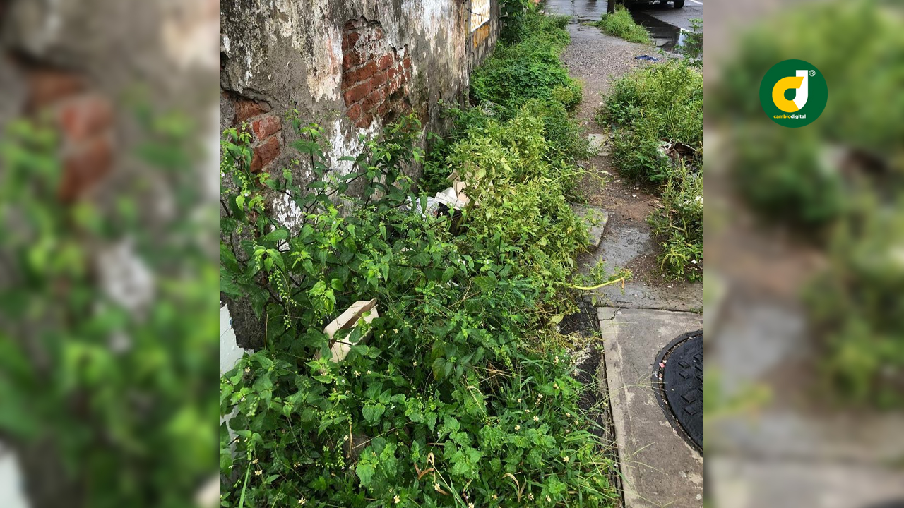 Eso que ve usted en las imágenes, es una parte de su estacionamiento cuya banqueta pública tienen en calidad de selva, llena de maleza, que además usan como basurero al aire público.