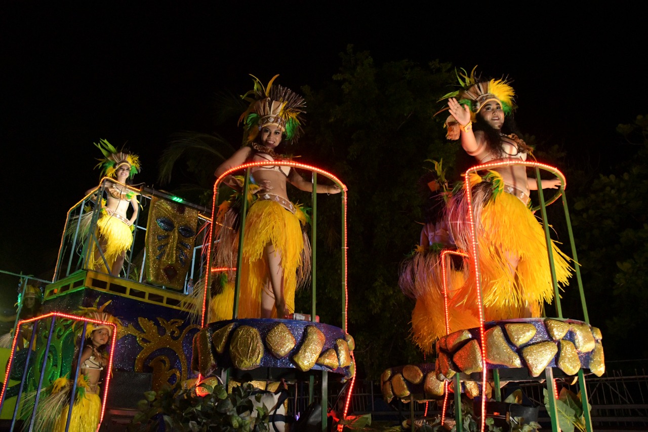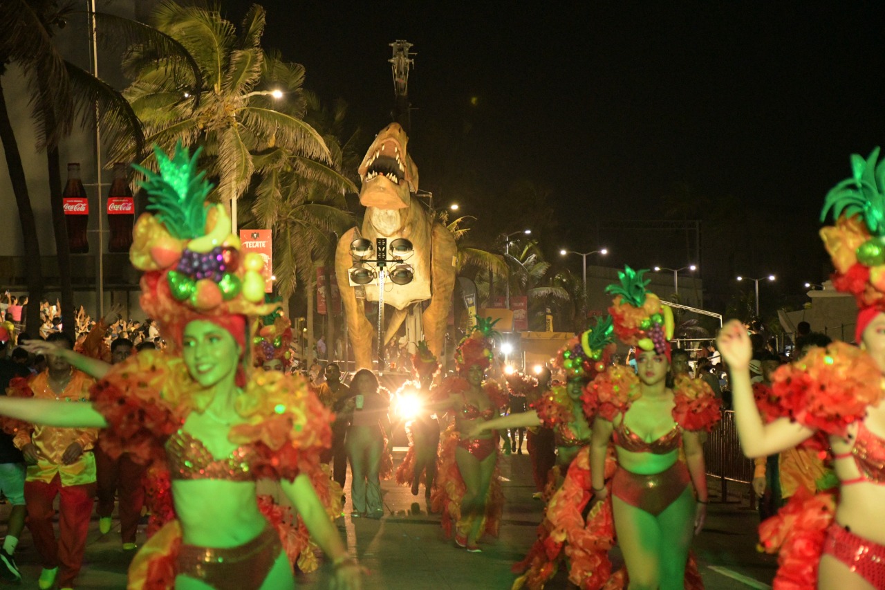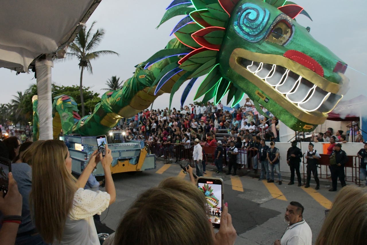 Los carros alegóricos, de los más vistosos, con figuras monumentales de 12 y 14 metros de altura, sin duda fueron la delicia de chicos y grandes; el Ave Fénix, el Quetzalcóalt echando humo de colores y un dinosaurio gigante.