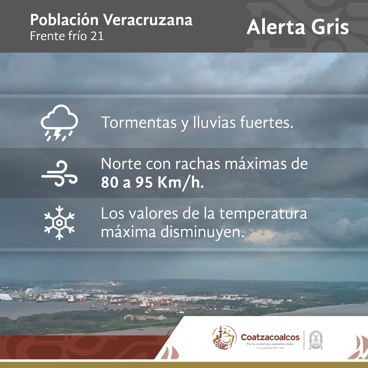Coatzacoalcos, Ver.- La dirección de Protección Civil (PC) de Coatzacoalcos informó que a nivel estatal se emitió la Alerta Gris ante el ingreso del Frente Frío número 21 que estará llegando a la entidad veracruzana este lunes.
