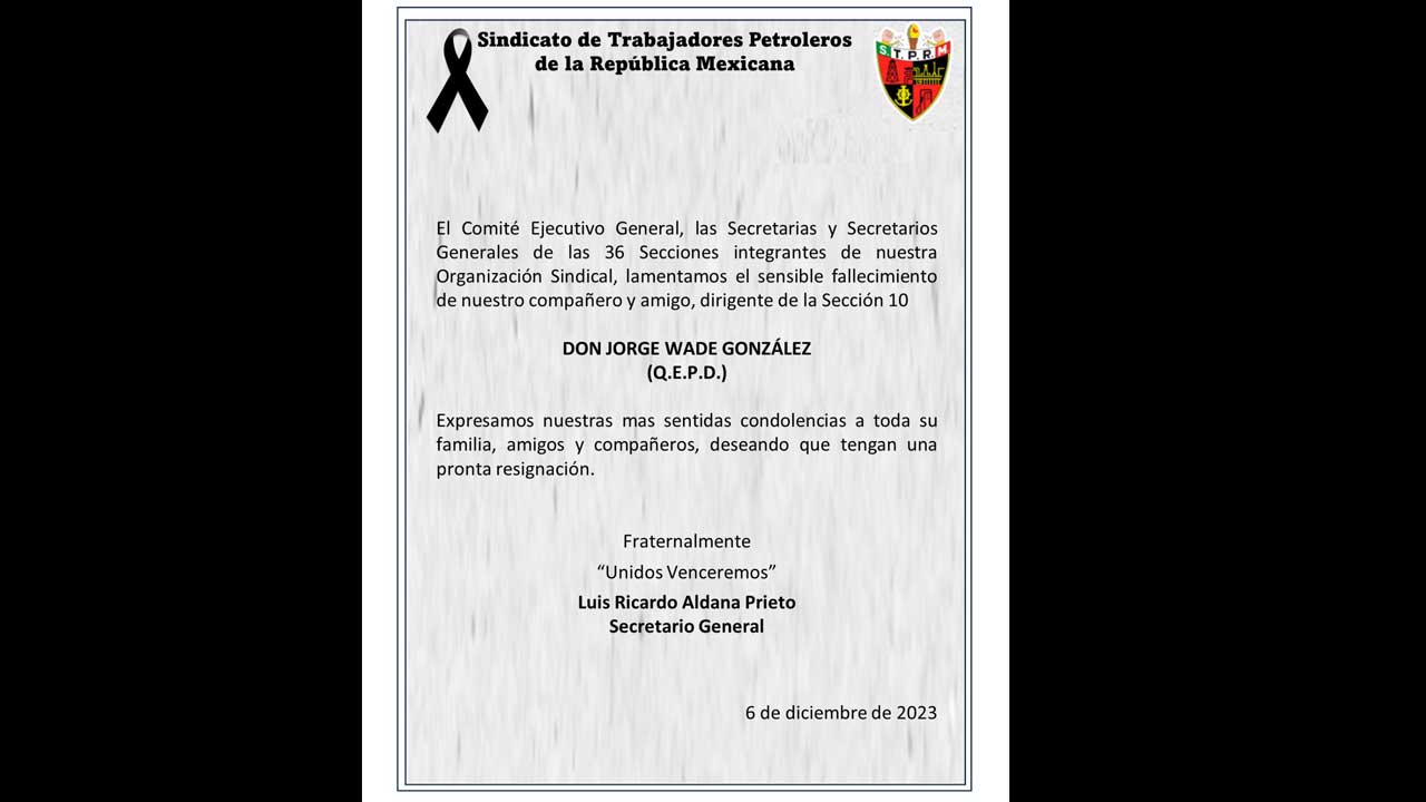 El Comité Ejecutivo Nacional del Sindicato de Trabajadores Petroleros de la República Mexicana informó del deceso del jefe político de los petroleros en la zona sur.