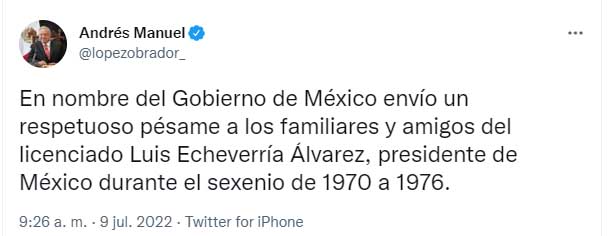 El actual presidente de la República, Andrés Manuel López Obrador expresó “En nombre del Gobierno de México envío un respetuoso pésame a los familiares y amigos del licenciado Luis Echeverría Álvarez, presidente de México durante el sexenio de 1970 a 1976”.